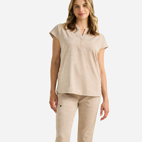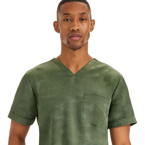 This top mixes style with utility in a way that makes it great for long work days. It has a subtle camo print for a bit of character without being over the top. The mandarin collar and snap placket give it a crisp, clean look that feels a bit more polished than the usual scrub top.