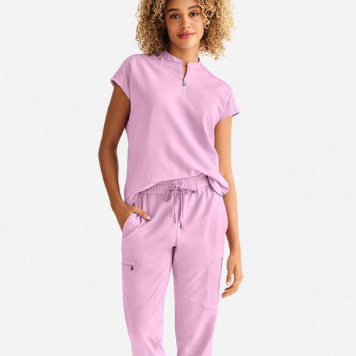 This scrub top aims to be both comfy and a little sporty, ideal for busy days when you’re moving a lot. It features a mandarin collar with a zip front (placket), so instead of buttons, you’ve got a zipper, which can be quicker to pull up or down. There’s a reflective trim along the zip to help with visibility.